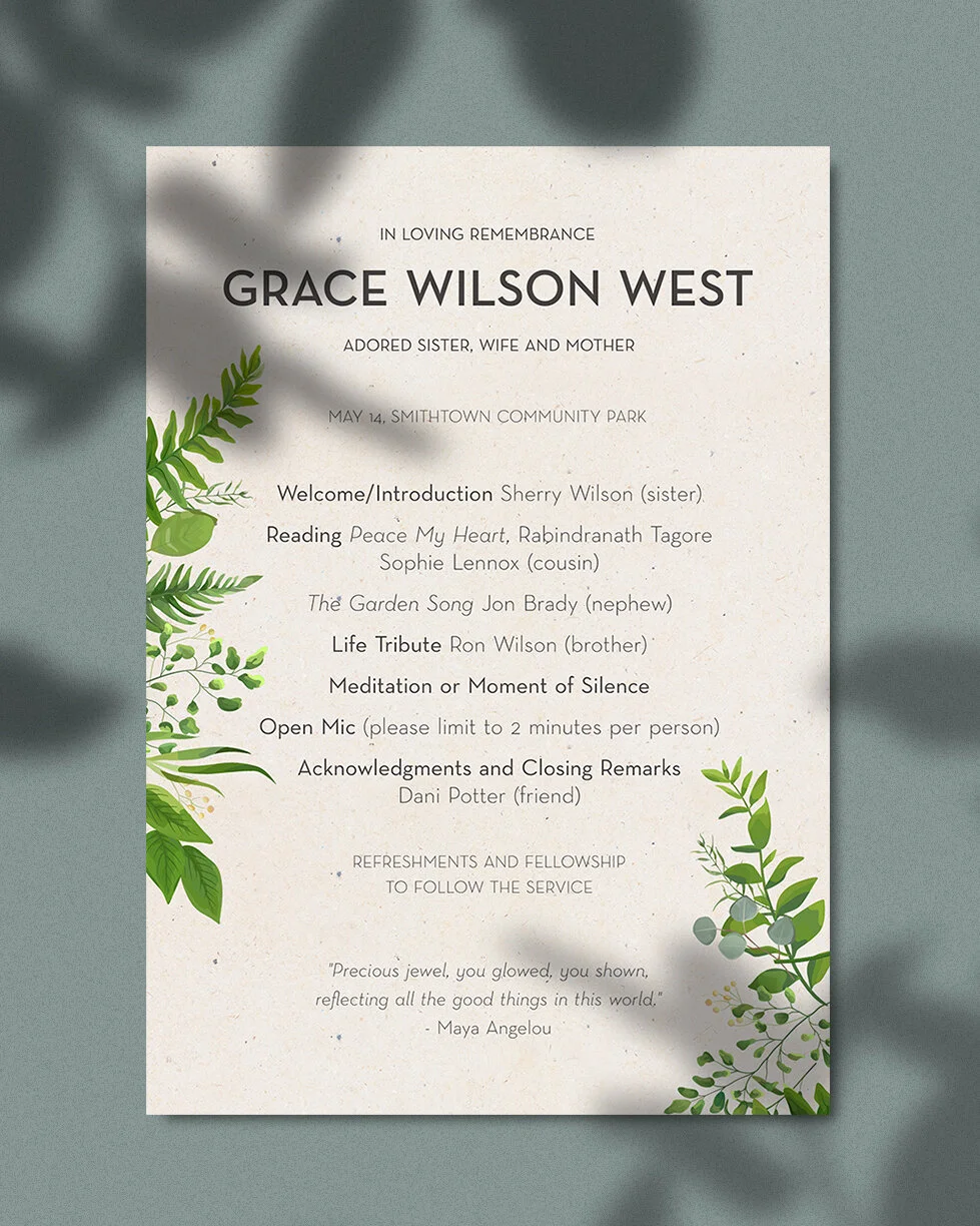 Find attached an example of an Order of Service. You can click this link to find out more on how to write an Order of Service. Or dowload an example.